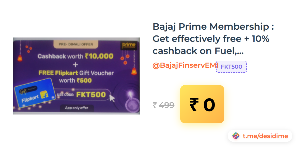 100% off on - Bajaj Prime Membership : Get effectively free + 10% cashback on Fuel, Bill payments every month - Rs. 0