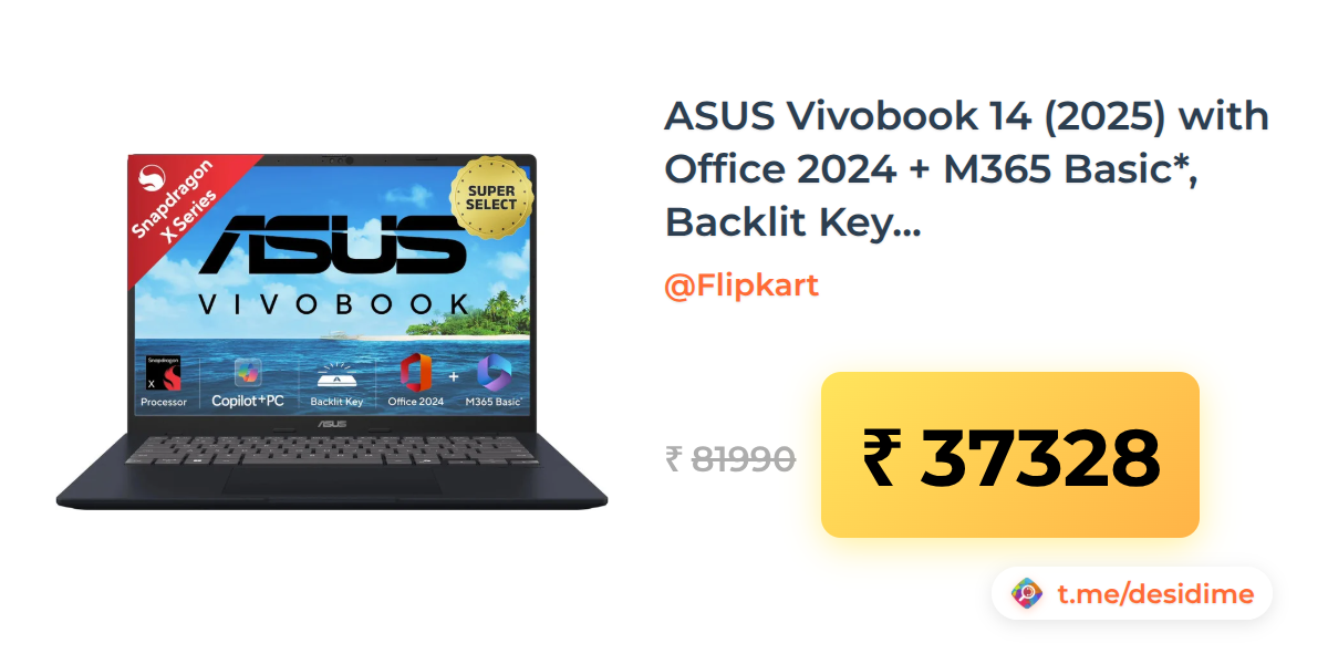 54% off on - ASUS Vivobook 14 (2025) with Office 2024 + M365 Basic*, Backlit Keyboard, Qualcomm Snapdragon X - Rs. 37328