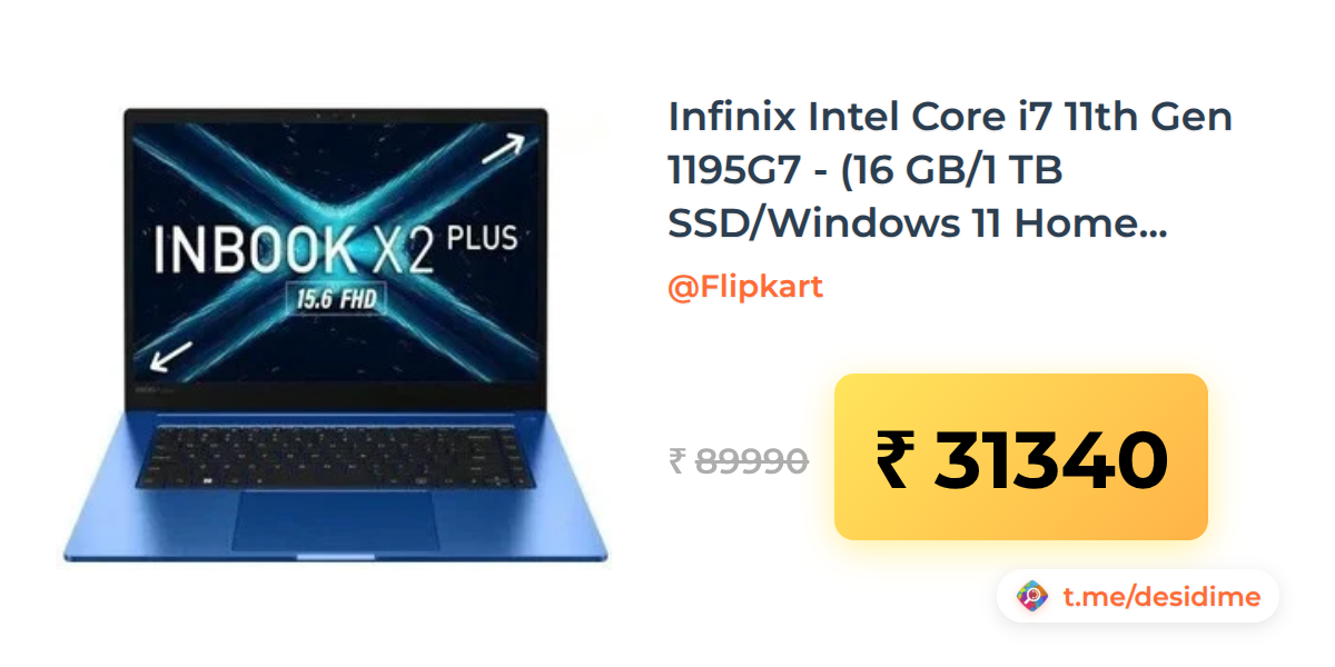 65% off on - Infinix Intel Core i7 11th Gen 1195G7 - (16 GB/1 TB SSD/Windows 11 Home) INBook X2 Plus Core i7 Thin and Light Laptop - Rs. 31340