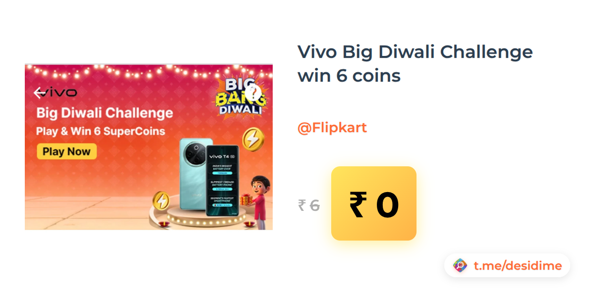 100% off on - Vivo Big Diwali Challenge win 6 coins - Rs. 0