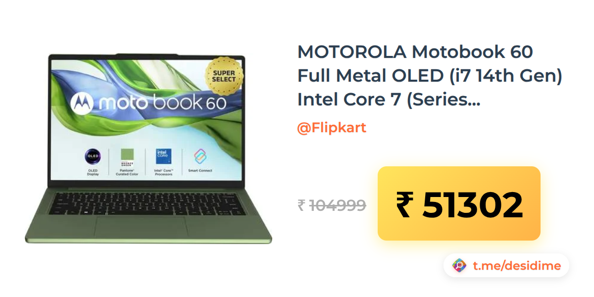 51% off on - MOTOROLA Motobook 60 Full Metal OLED (i7 14th Gen) Intel Core 7 (Series 2) 240H - (16 GB/512 GB SSD) - Rs. 51302