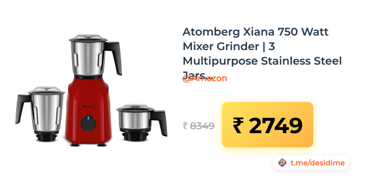 67% off on - Atomberg Xiana 750 Watt Mixer Grinder | 3 Multipurpose Stainless Steel Jars | Fiery Red - Rs. 2749