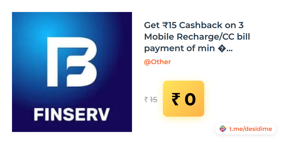 100% off on - Get ₹15 Cashback on 3 Mobile Recharge/CC bill payment of min ₹10: Bajaj Finserv (User Specific) - Rs. 0
