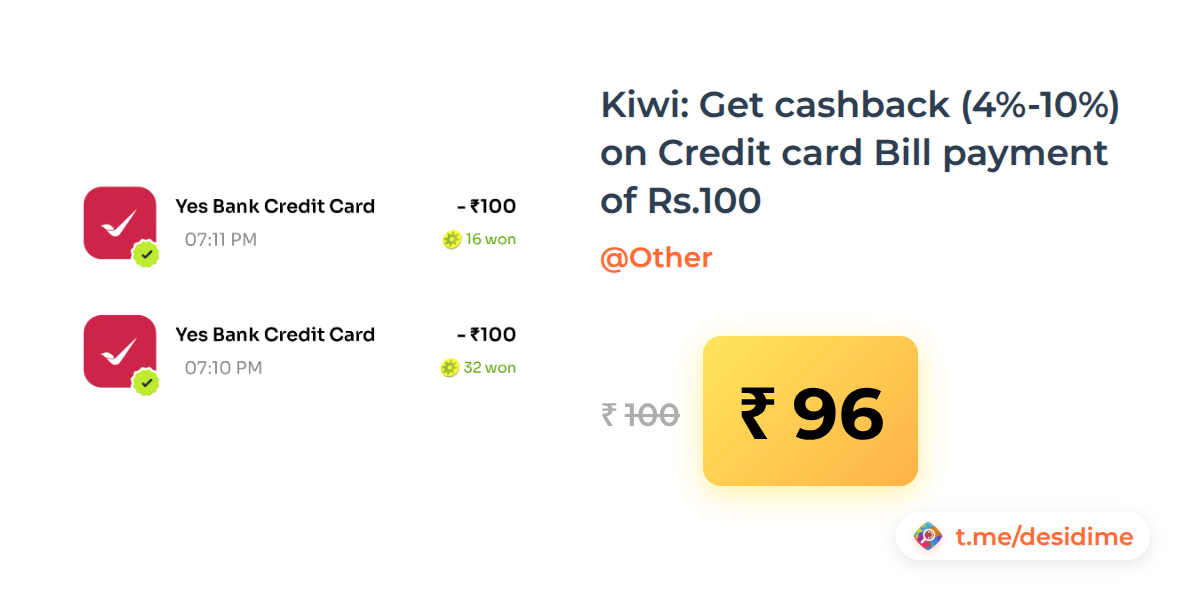 4% off on - Kiwi: Get cashback (4%-10%) on Credit card Bill payment of Rs.100 - Rs. 96