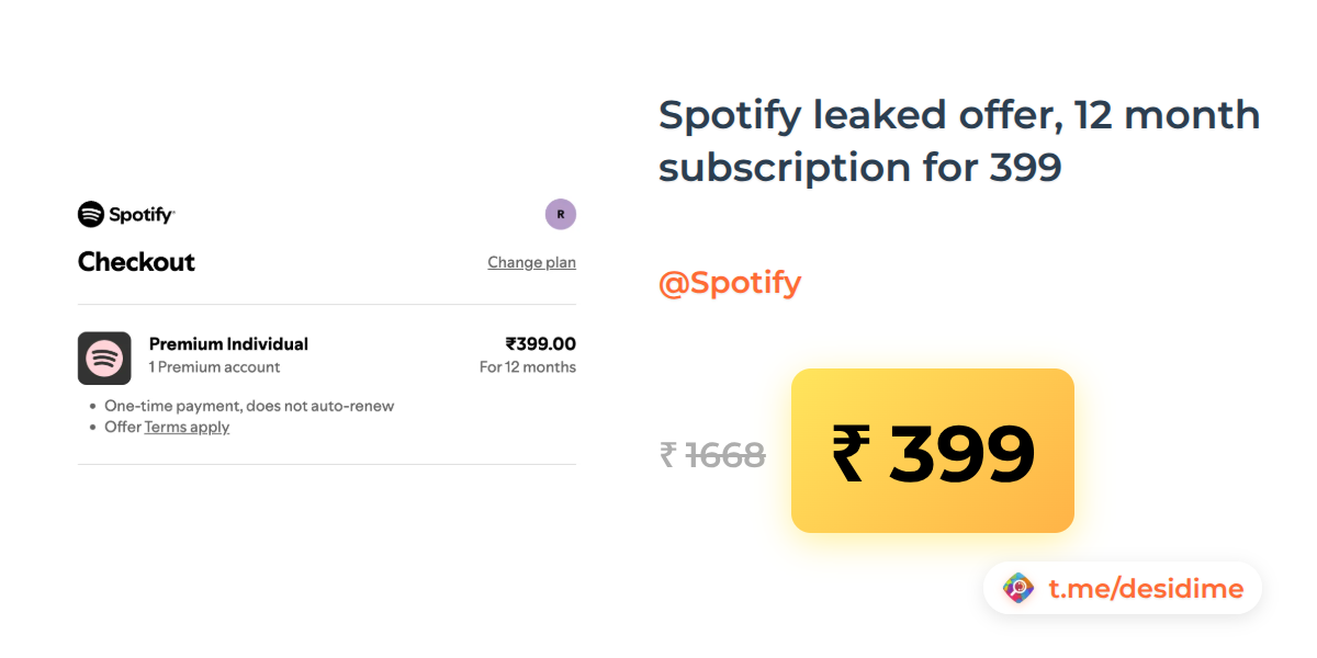 76% off on - Spotify leaked offer, 12 month subscription for 399 - Rs. 399
