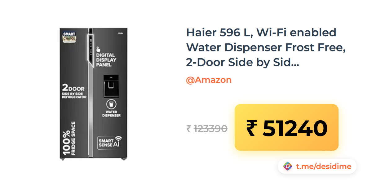 58% off on - Haier 596 L, Wi-Fi enabled Water Dispenser Frost Free, 2-Door Side by Side Refrigerator (HRS-682WGKU1) - Rs. 51240