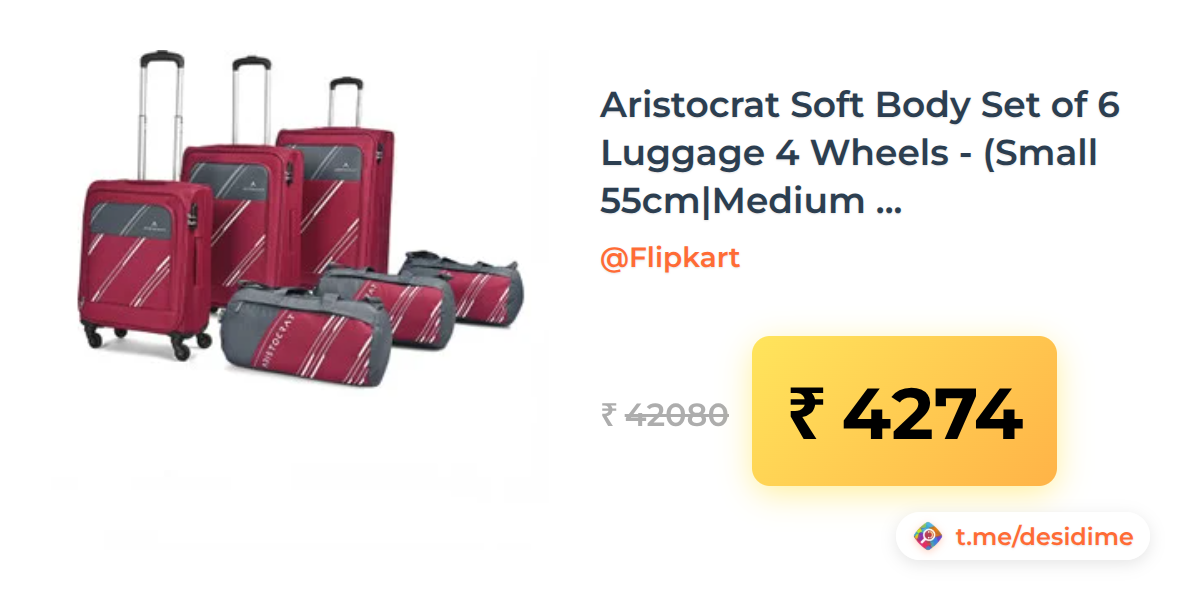 90% off on - Aristocrat Soft Body Set of 6 Luggage 4 Wheels - (Small 55cm|Medium 68cm|Large 78cm|3 Duffle Bag) - Rs. 4274