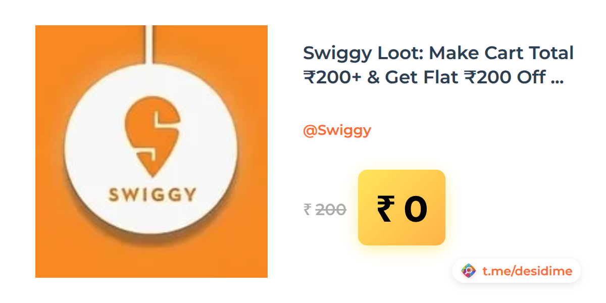 100% off on - Swiggy Loot: Make Cart Total ₹200+ & Get Flat ₹200 Off Working on All Restaurants - Rs. 0