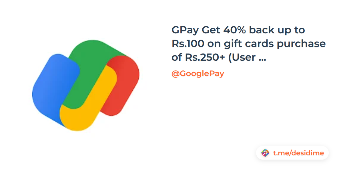 GPay Get 40% back up to Rs.100 on gift cards purchase of Rs.250+ (User specific) expires on 20th October 2025