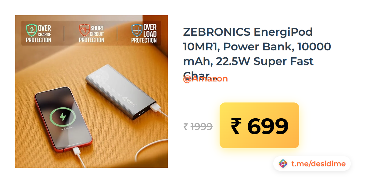65% off on - ZEBRONICS EnergiPod 10MR1, Power Bank, 10000 mAh, 22.5W Super Fast Charging PD 3.0 (PPS) - Rs. 699