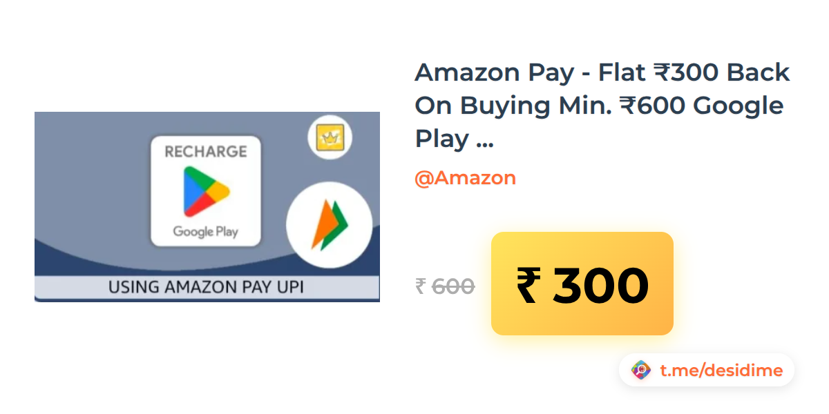 50% off on - Amazon Pay - Flat ₹300 Back On Buying Min. ₹600 Google Play Code Via UPI (User Specific) - Rs. 300