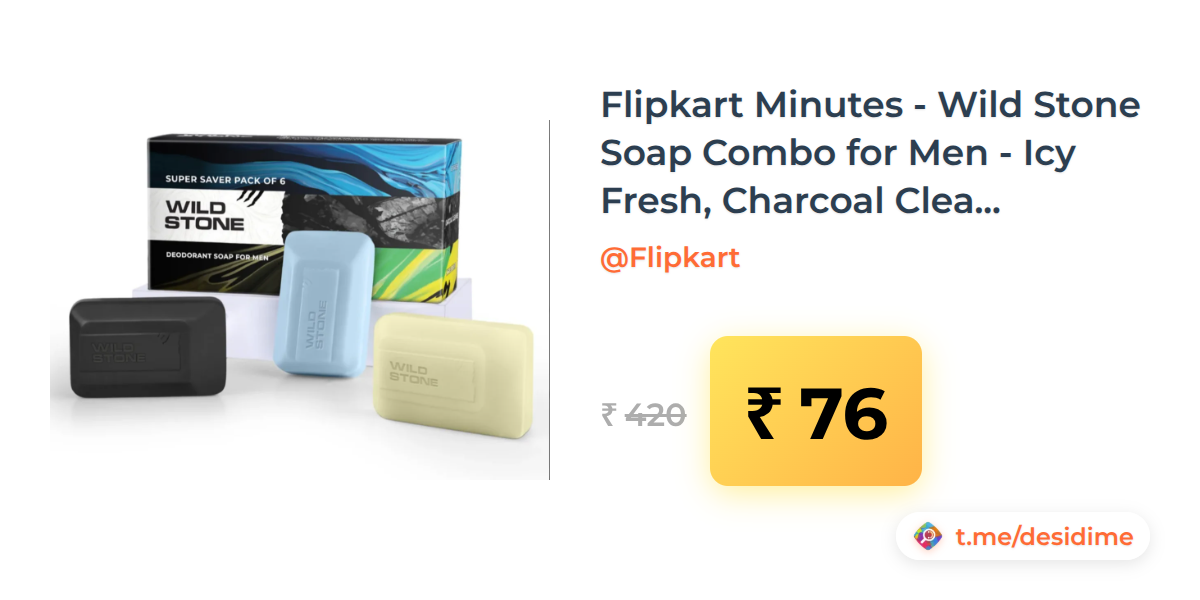 82% off on - Flipkart Minutes - Wild Stone Soap Combo for Men - Icy Fresh, Charcoal Cleanse & Citrus Burst | 100gm Each (6 × 100g) (location specific) - Rs. 76