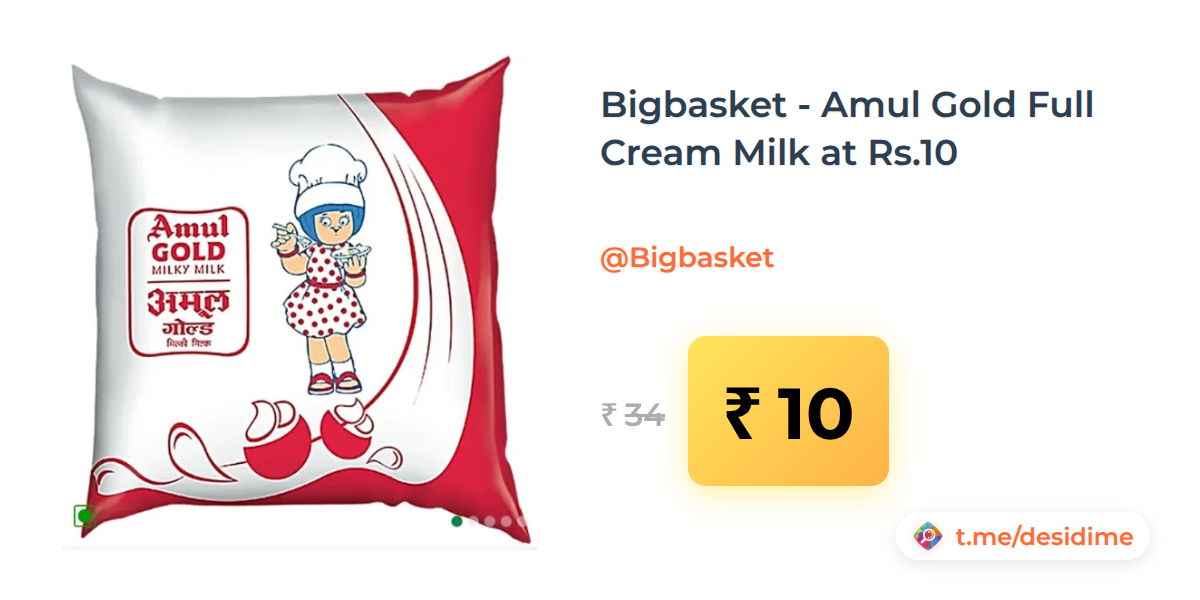 71% off on - Bigbasket - Amul Gold Full Cream Milk at Rs.10 - Rs. 10