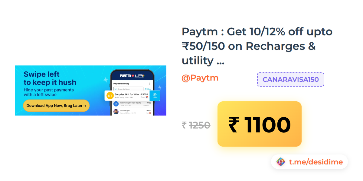 12% off on - Paytm : Get 10/12% off upto ₹50/150 on Recharges & utility bill payments using Canara Bank VISA Debit/Credit Cards - Rs. 1100
