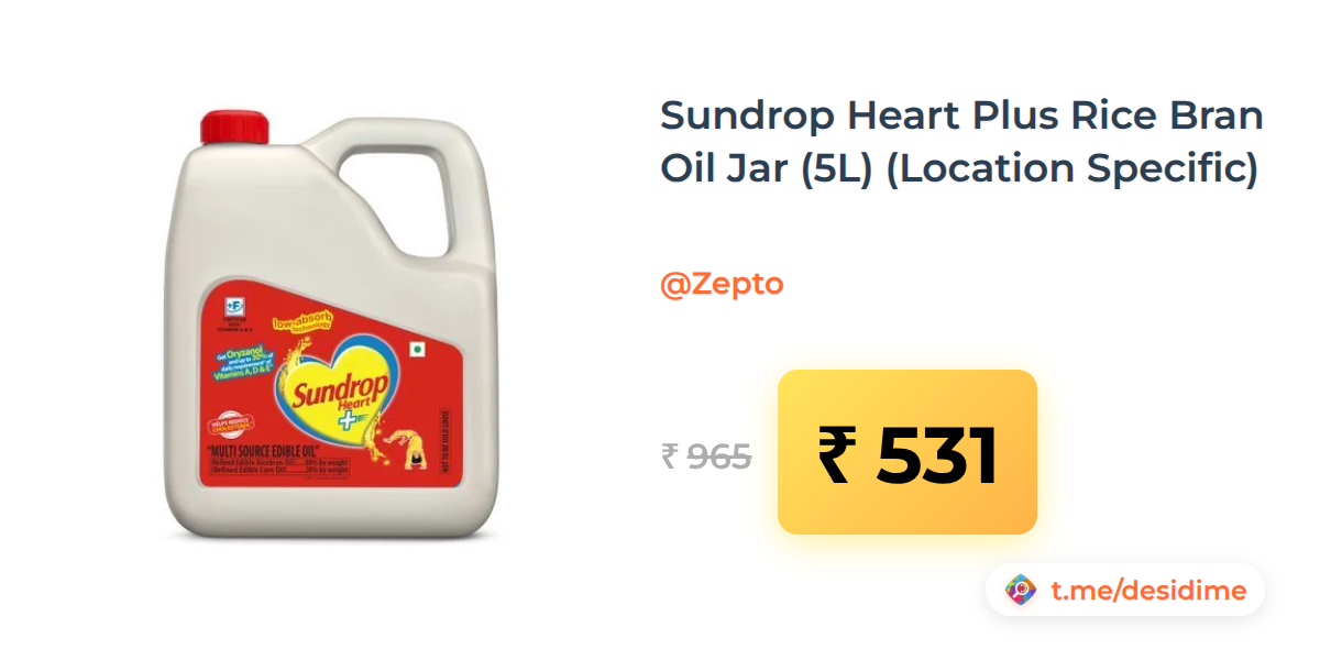 45% off on - Sundrop Heart Plus Rice Bran Oil Jar (5L) (Location Specific) - Rs. 531