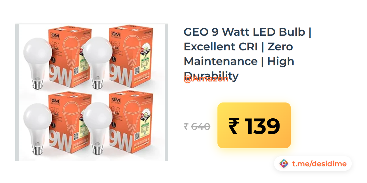 78% off on - GEO 9 Watt LED Bulb | Excellent CRI | Zero Maintenance | High Durability - Rs. 139