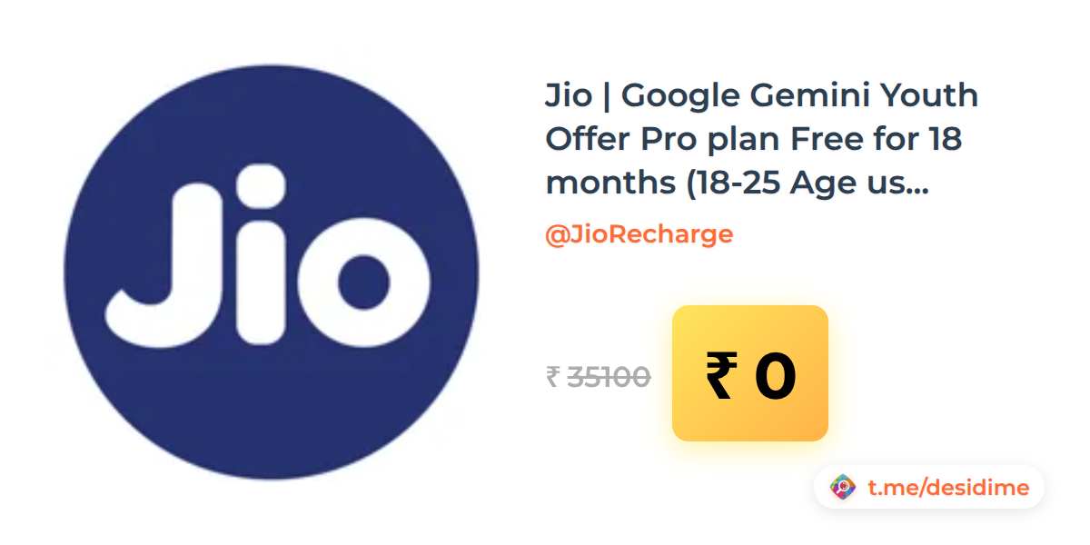 100% off on - Jio | Google Gemini Youth Offer Pro plan Free for 18 months (18-25 Age users on Unlimited 5G Plans) - Rs. 0