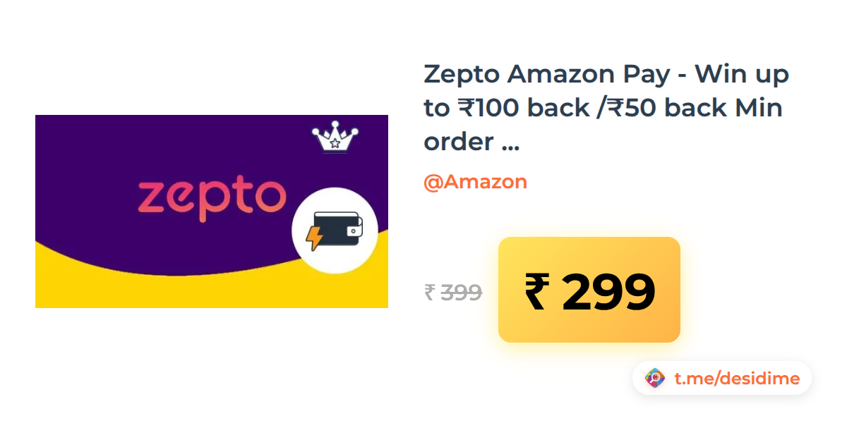 25% off on - Zepto Amazon Pay - Win up to ₹100 back /₹50 back Min order :₹399 - Rs. 299
