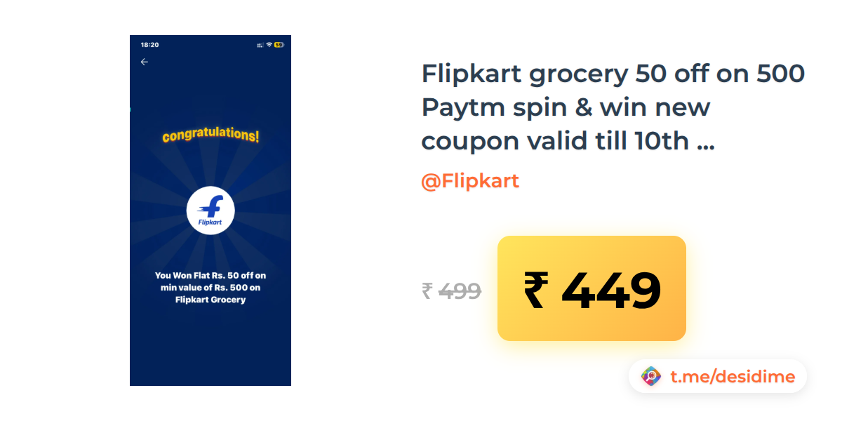 10% off on - Flipkart grocery 50 off on 500 Paytm spin & win new coupon valid till 10th DECEMBER - Rs. 449