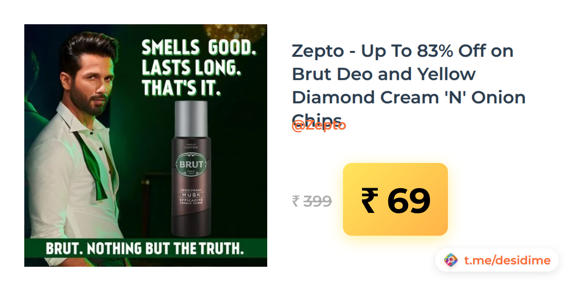 83% off on - Zepto - Up To 83% Off on Brut Deo and Yellow Diamond Cream 'N' Onion Chips - Rs. 69