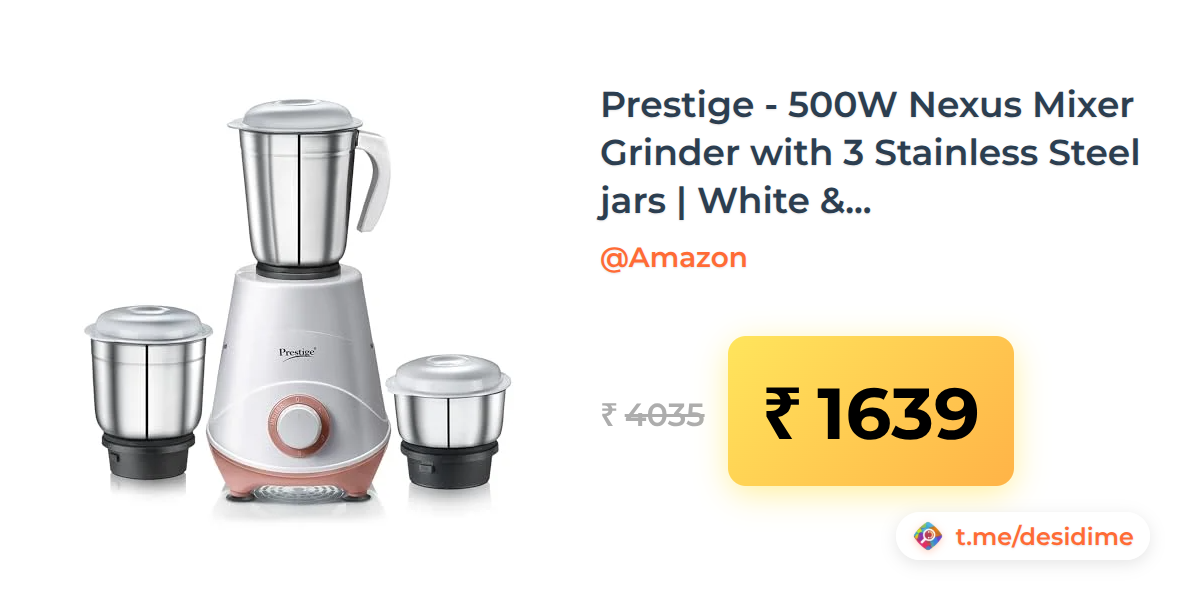59% off on - Prestige - 500W Nexus Mixer Grinder with 3 Stainless Steel jars | White & Rose Gold - Rs. 1639