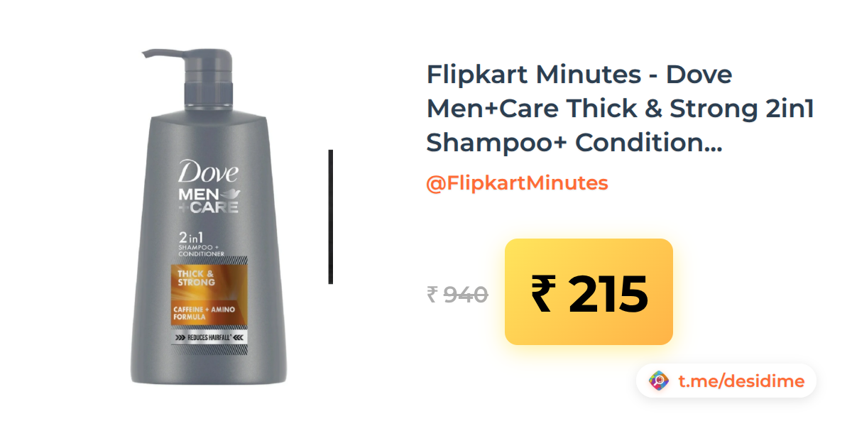 77% off on - Flipkart Minutes - Dove Men+Care Thick & Strong 2in1 Shampoo+ Conditioner 650ml (location specific) - Rs. 215