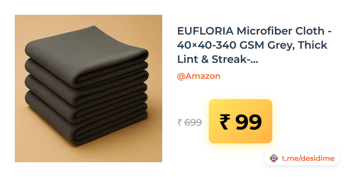 86% off on - EUFLORIA Microfiber Cloth - 40×40-340 GSM Grey, Thick Lint & Streak-Free Multipurpose Cloths - (Pack of 4) - Rs. 99