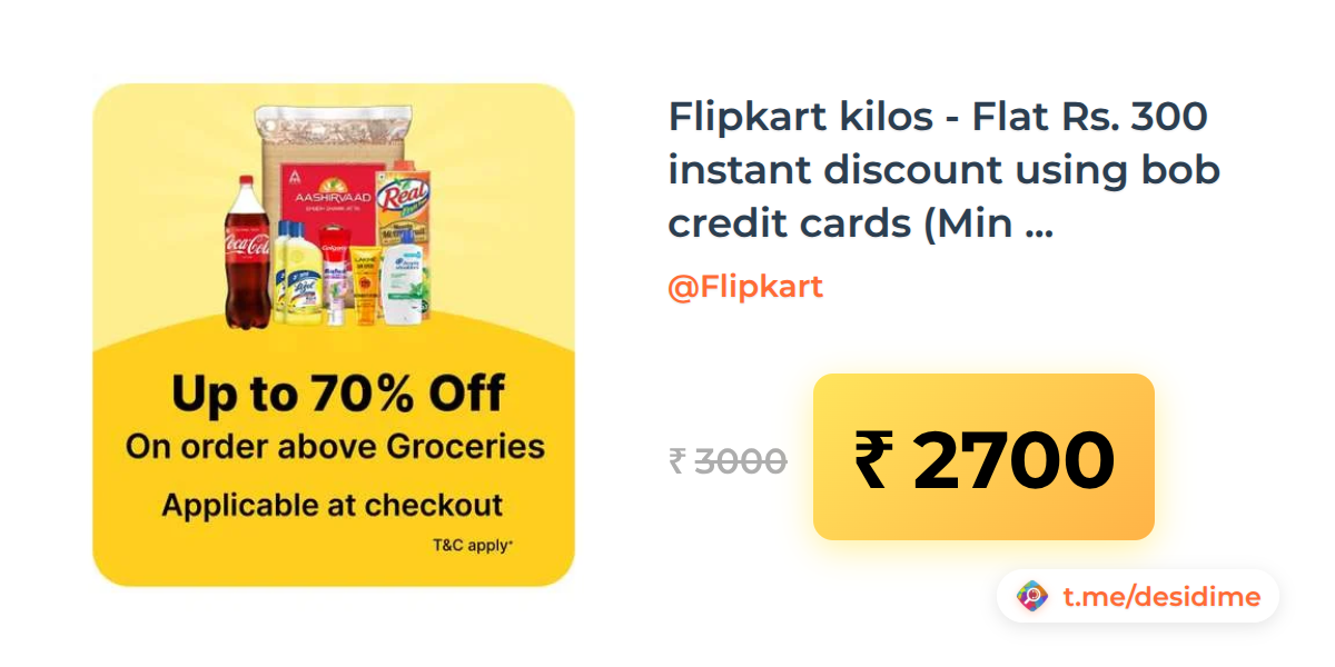 10% off on - Flipkart kilos - Flat Rs. 300 instant discount using bob credit cards (Min order Rs. 3000) - Rs. 2700