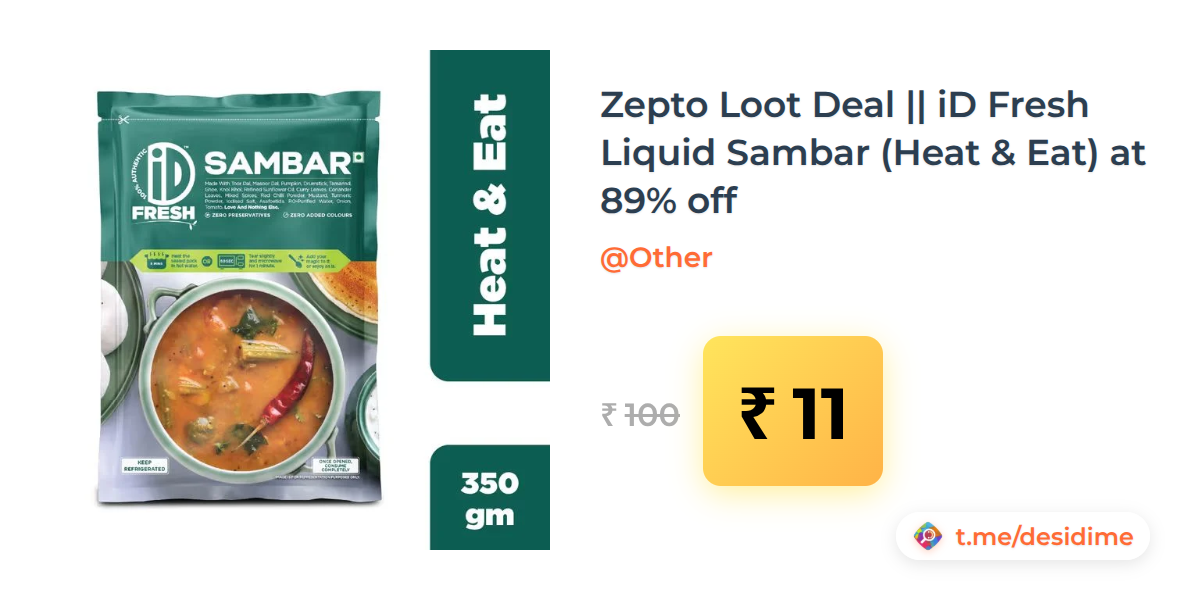89% off on - Zepto Loot Deal || iD Fresh Liquid Sambar (Heat & Eat) at 89% off - Rs. 11