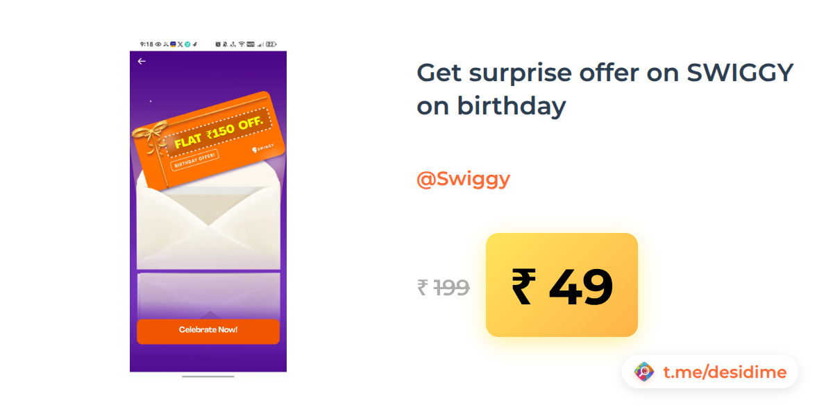 75% off on - Get surprise offer on SWIGGY on birthday - Rs. 49