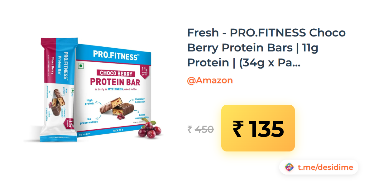 70% off on - Fresh - PRO.FITNESS Choco Berry Protein Bars | 11g Protein | (34g x Pack of 6) (location specific) - Rs. 135