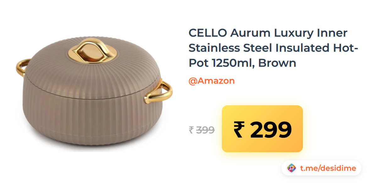 25% off on - CELLO Aurum Luxury Inner Stainless Steel Insulated Hot-Pot 1250ml, Brown - Rs. 299