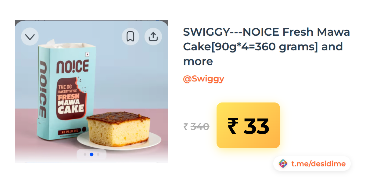90% off on - SWIGGY---NOICE Fresh Mawa Cake[90g*4=360 grams] and more - Rs. 33