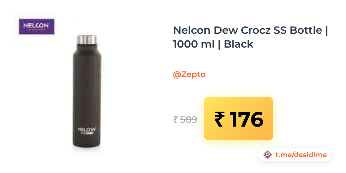 70% off on - Nelcon Dew Crocz SS Bottle | 1000 ml | Black - Rs. 176