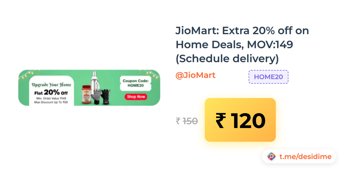 20% off on - JioMart: Extra 20% off on Home Deals, MOV:149 (Schedule delivery) - Rs. 120