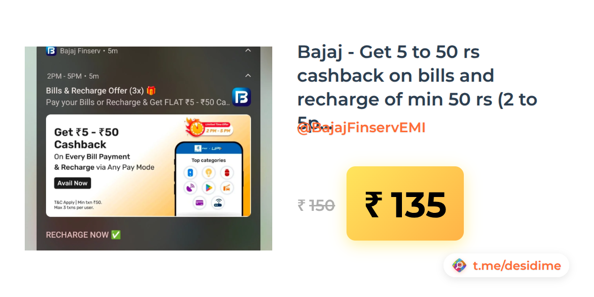 10% off on - Bajaj - Get 5 to 50 rs cashback on bills and recharge of min 50 rs (2 to 5pm) (3times) - Rs. 135