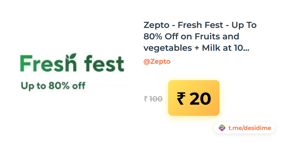 80% off on - Zepto - Fresh Fest - Up To 80% Off on Fruits and vegetables + Milk at 10% Off - Rs. 20