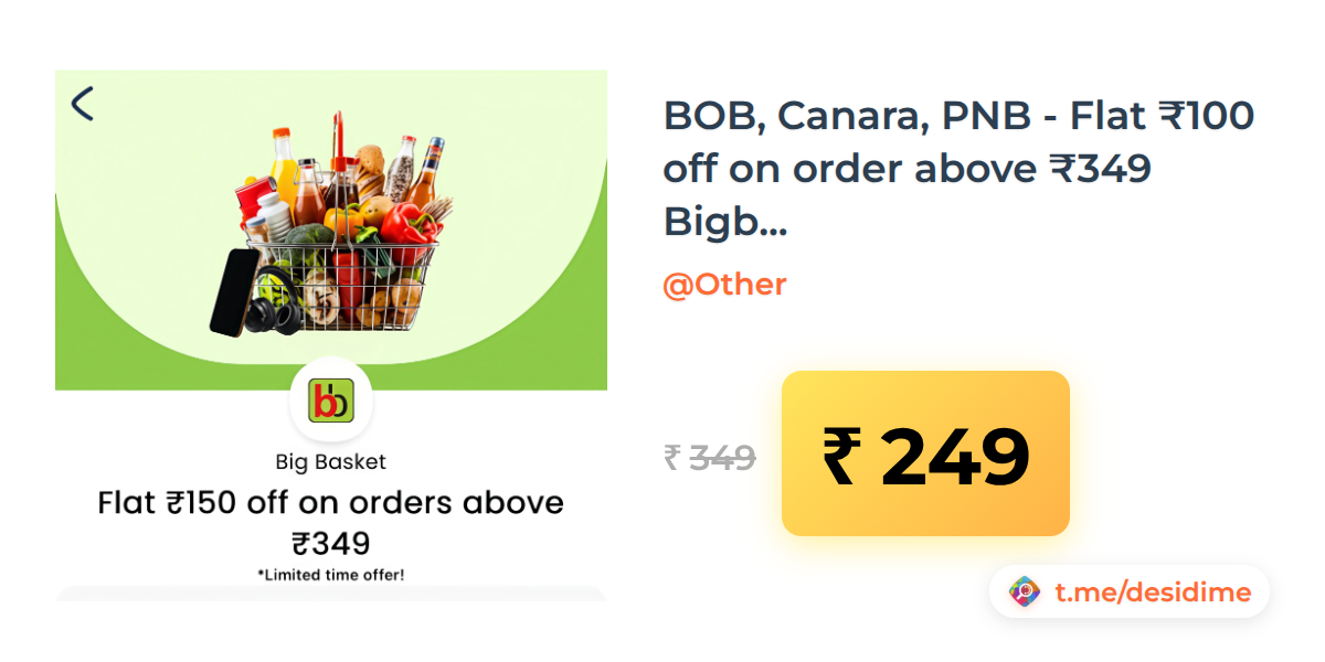 29% off on - BOB, Canara, PNB - Flat ₹100 off on order above ₹349 Bigbasket voucher (old user working) - Rs. 249