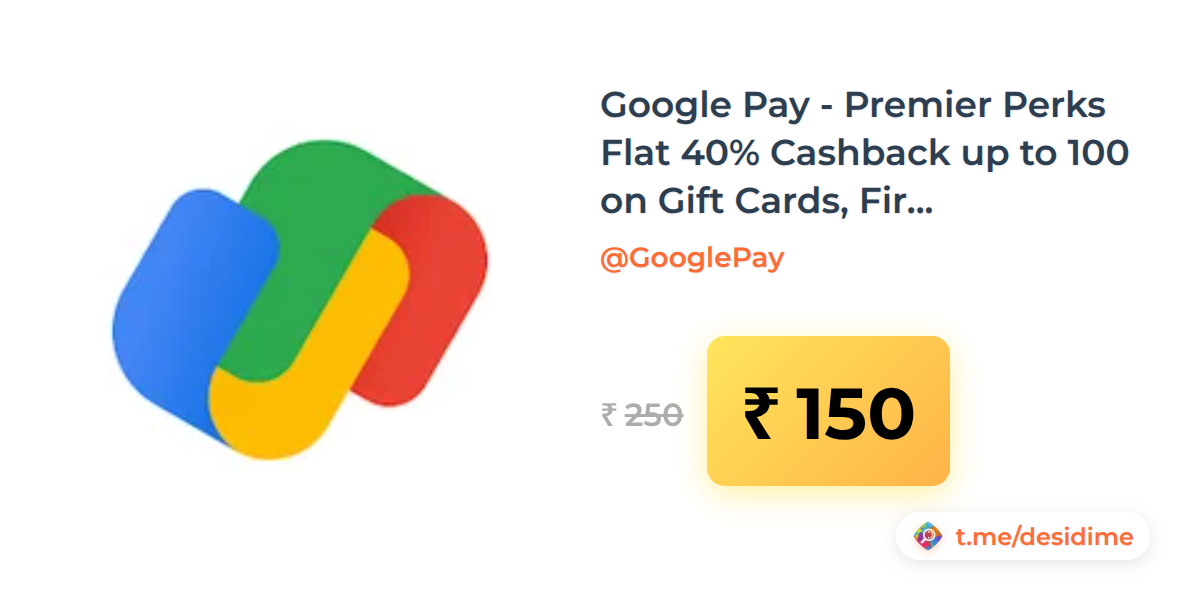 40% off on - Google Pay - Premier Perks Flat 40% Cashback up to 100 on Gift Cards, First 10k Users - Rs. 150