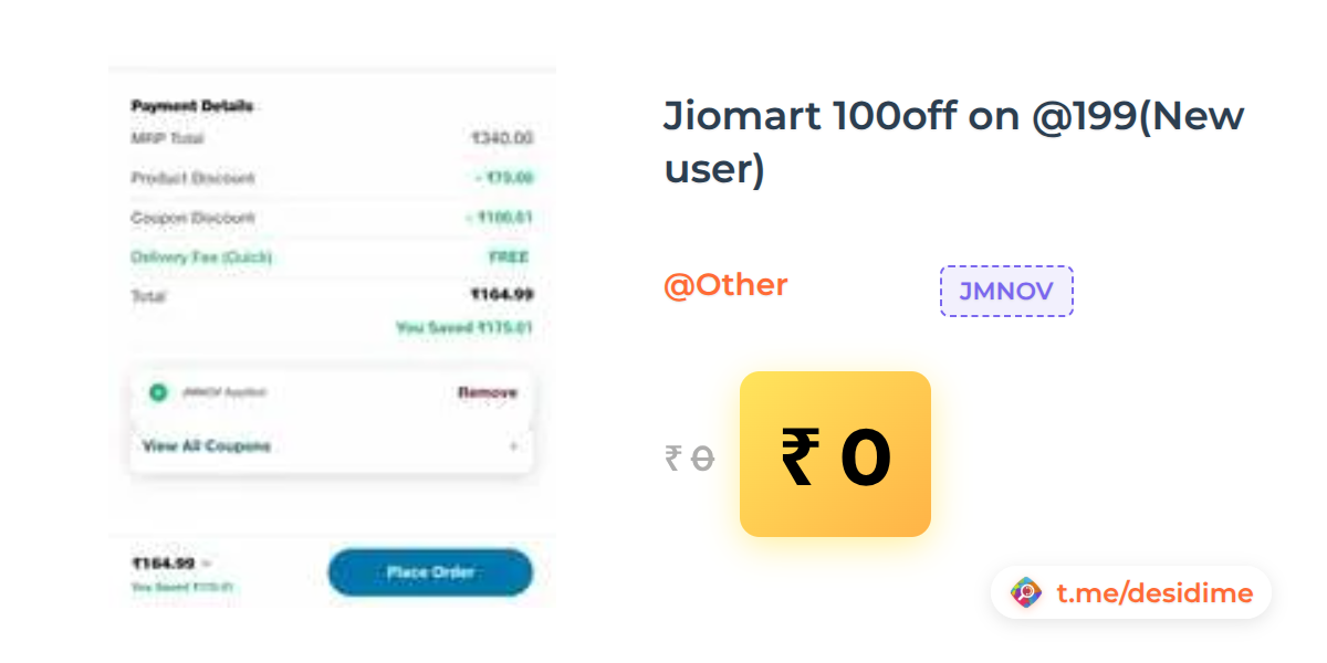 50% off on - Jiomart 100off on @199(New user) - Rs. 0