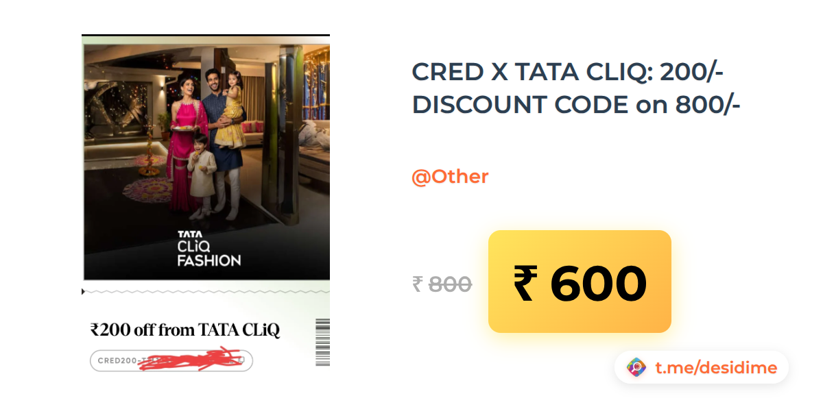 25% off on - CRED X TATA CLIQ: 200/- DISCOUNT CODE on 800/- - Rs. 600
