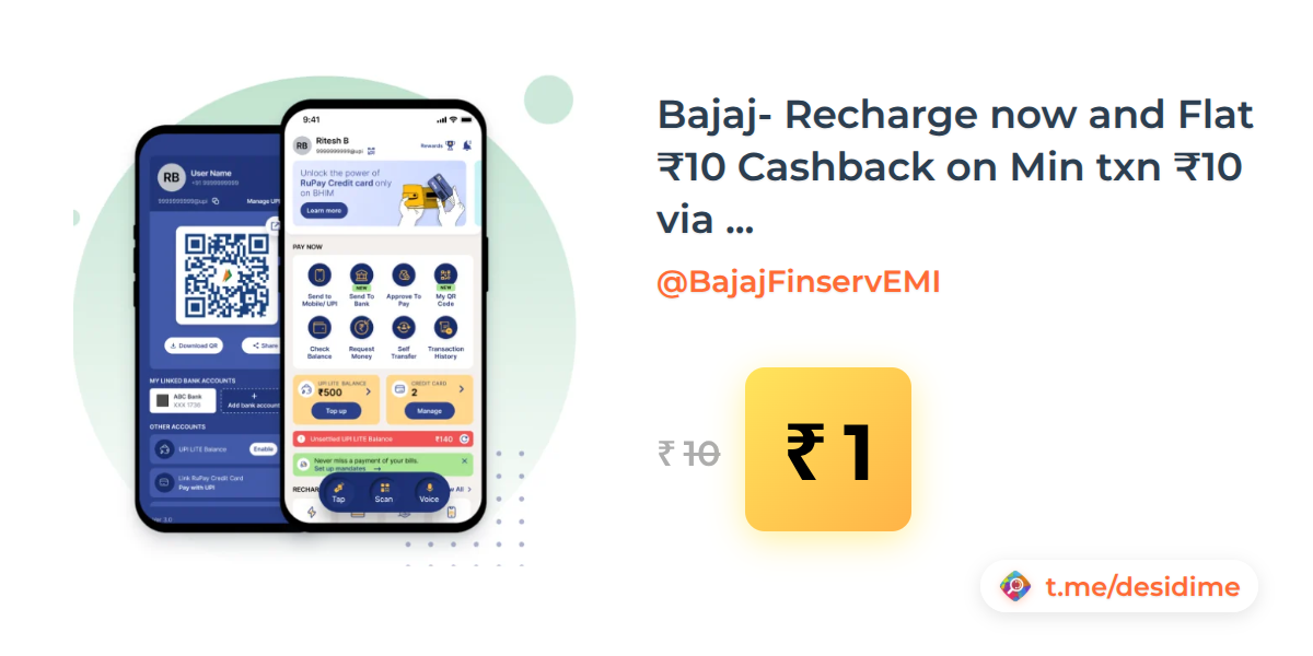 90% off on - Bajaj- Recharge now and Flat ₹10 Cashback on Min txn ₹10 via any mode - Rs. 1