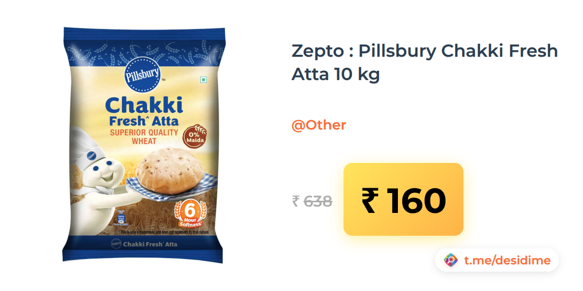 75% off on - Zepto : Pillsbury Chakki Fresh Atta 10 kg - Rs. 160