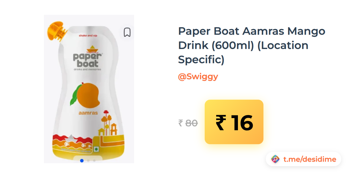 80% off on - Paper Boat Aamras Mango Drink (600ml) (Location Specific) - Rs. 16