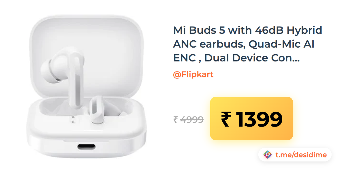 72% off on - Mi Buds 5 with 46dB Hybrid ANC earbuds, Quad-Mic AI ENC , Dual Device Connection Bluetooth (Fusion White, True Wireless) - Rs. 1399