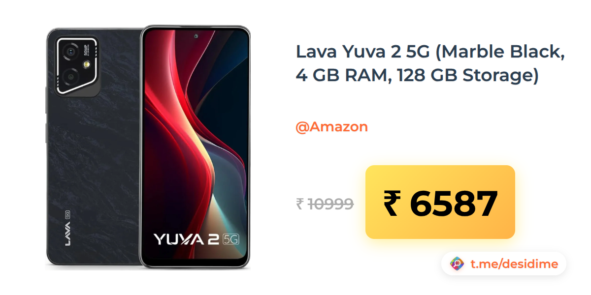 40% off on - Lava Yuva 2 5G (Marble Black, 4 GB RAM, 128 GB Storage) - Rs. 6587