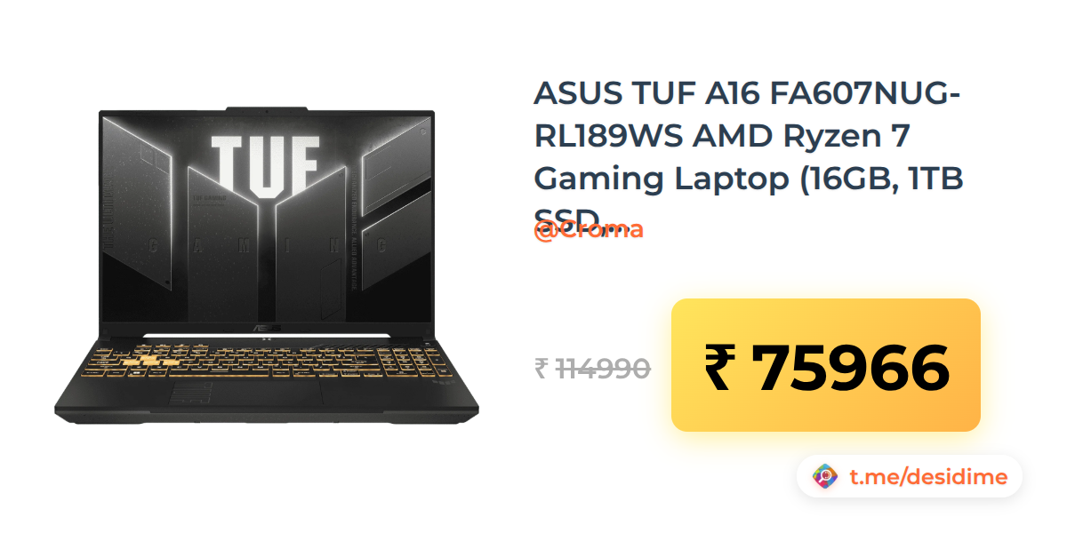 34% off on - ASUS TUF A16 FA607NUG-RL189WS AMD Ryzen 7 Gaming Laptop (16GB, 1TB SSD, Windows 11 Home 2024, Mecha Gray, 4.48 KG) - Rs. 75966