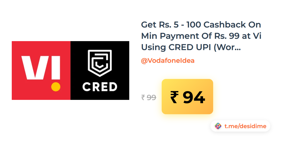 5% off on - Get Rs. 5 - 100 Cashback On Min Payment Of Rs. 99 at Vi Using CRED UPI (Working On CC Bill Payment) - Rs. 94