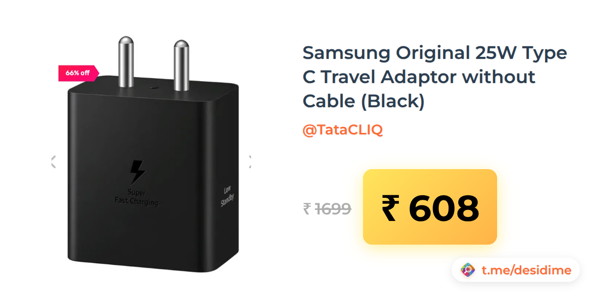 64% off on - Samsung Original 25W Type C Travel Adaptor without Cable (Black) - Rs. 608