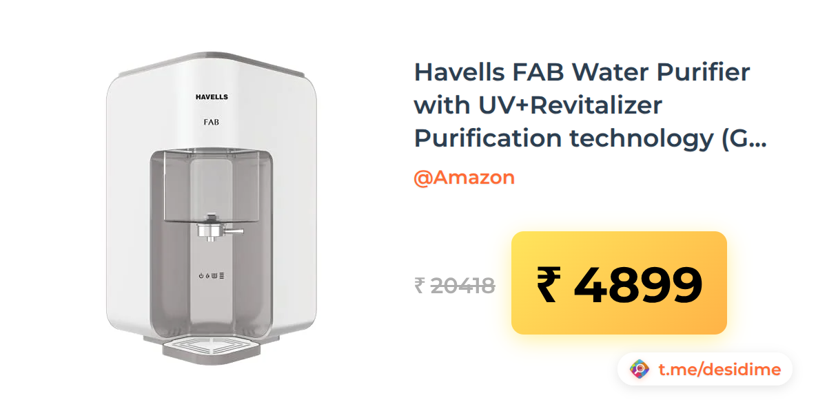 76% off on - Havells FAB Water Purifier with UV+Revitalizer Purification technology (Grey and White) - Rs. 4899